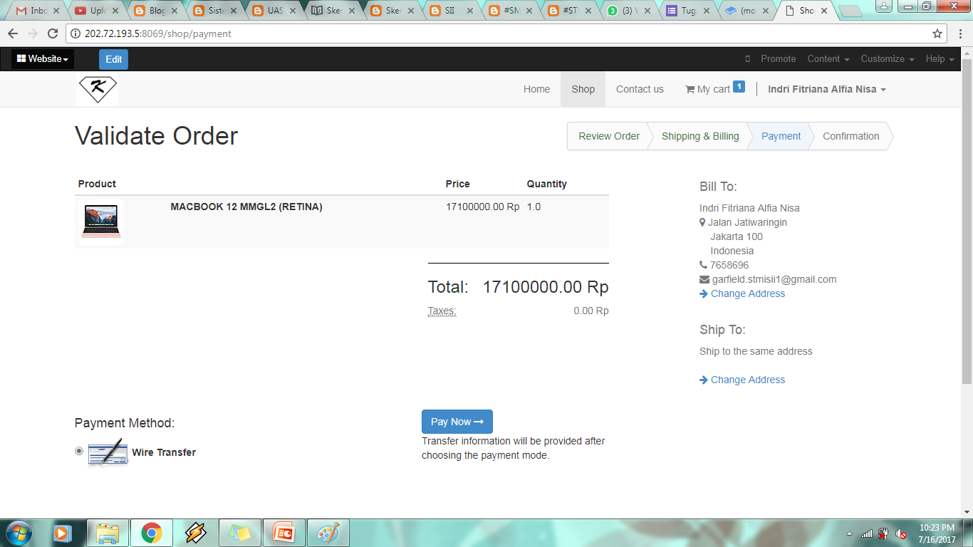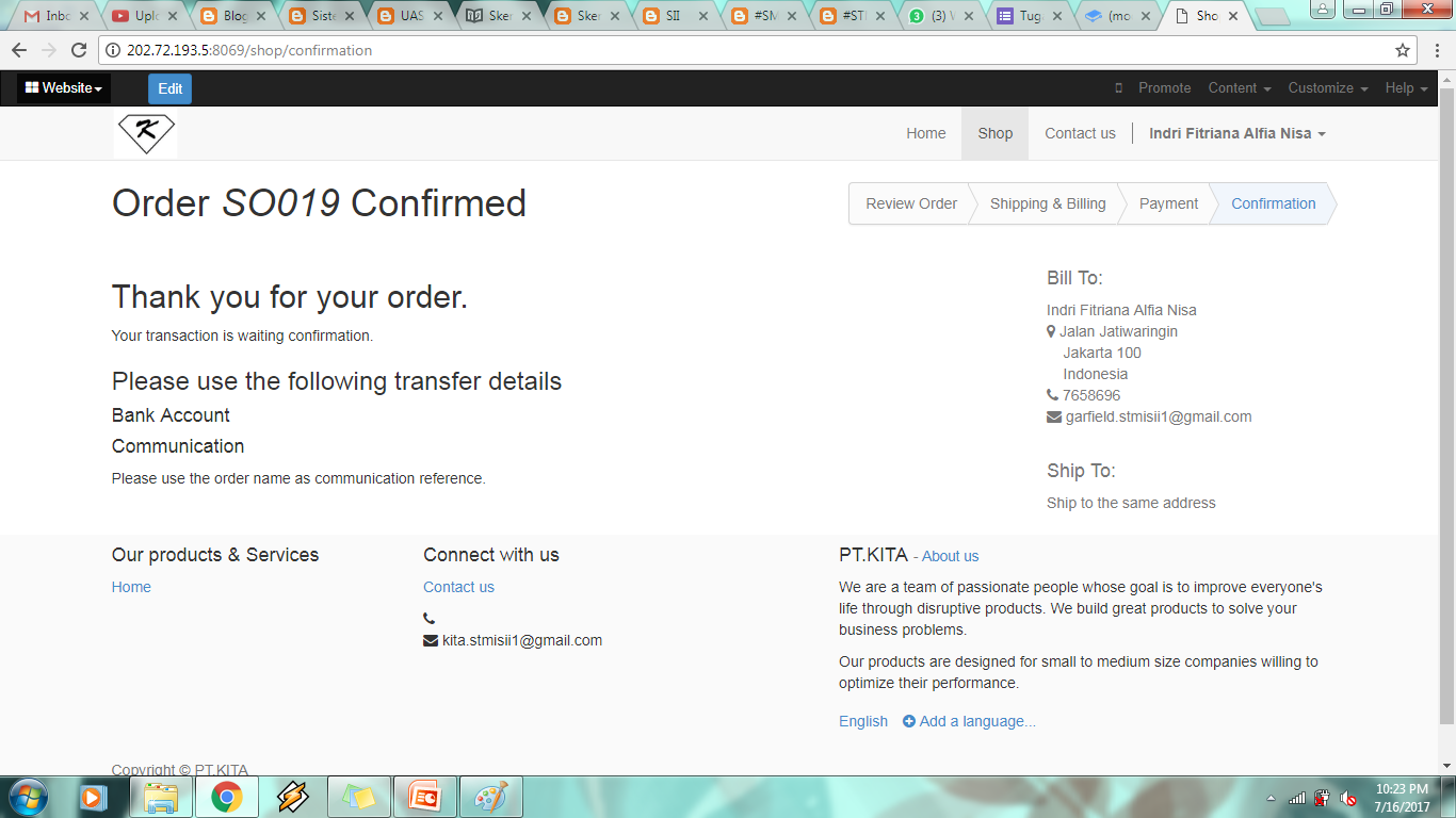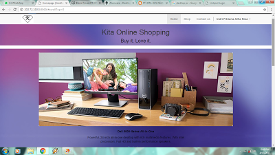 - Setelah puas mengedit tampilan website, coba untuk membeli sesuatu via website untuk memastikan bahwa website dapat digunakan untuk online shopping. Berikut skenario transaksi berbelanja di website PT Kita