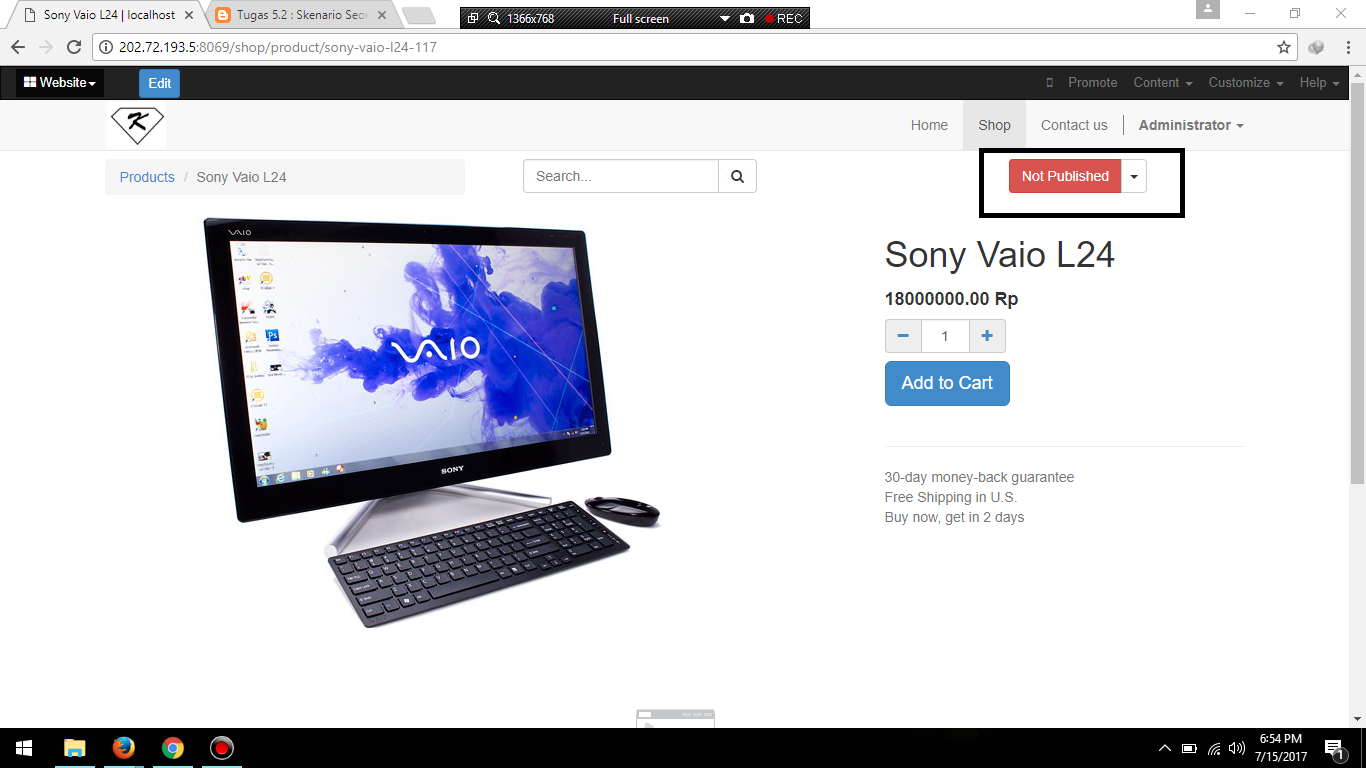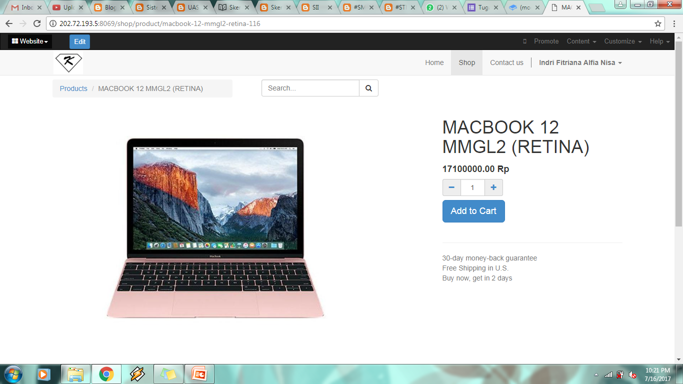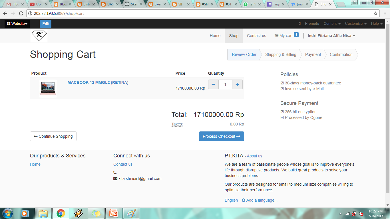 - Setelah puas mengedit tampilan website, coba untuk membeli sesuatu via website untuk memastikan bahwa website dapat digunakan untuk online shopping. Berikut skenario transaksi berbelanja di website PT Kita